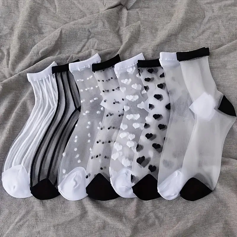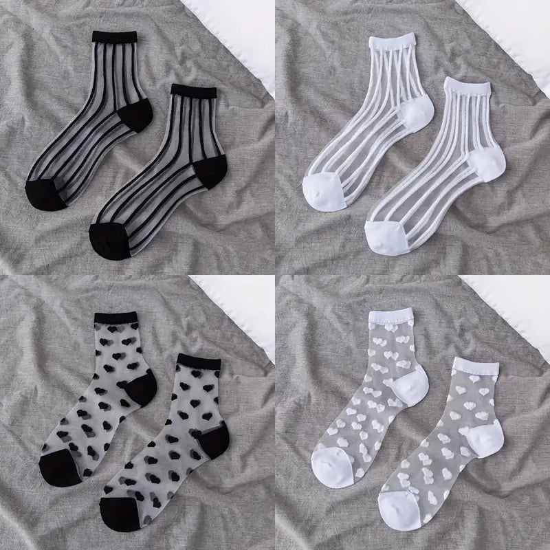 Lot de 4 Paires de Chaussettes Transparentes Motifs Cœurs et Rayures – Élégantes & Respirantes pour Femme
