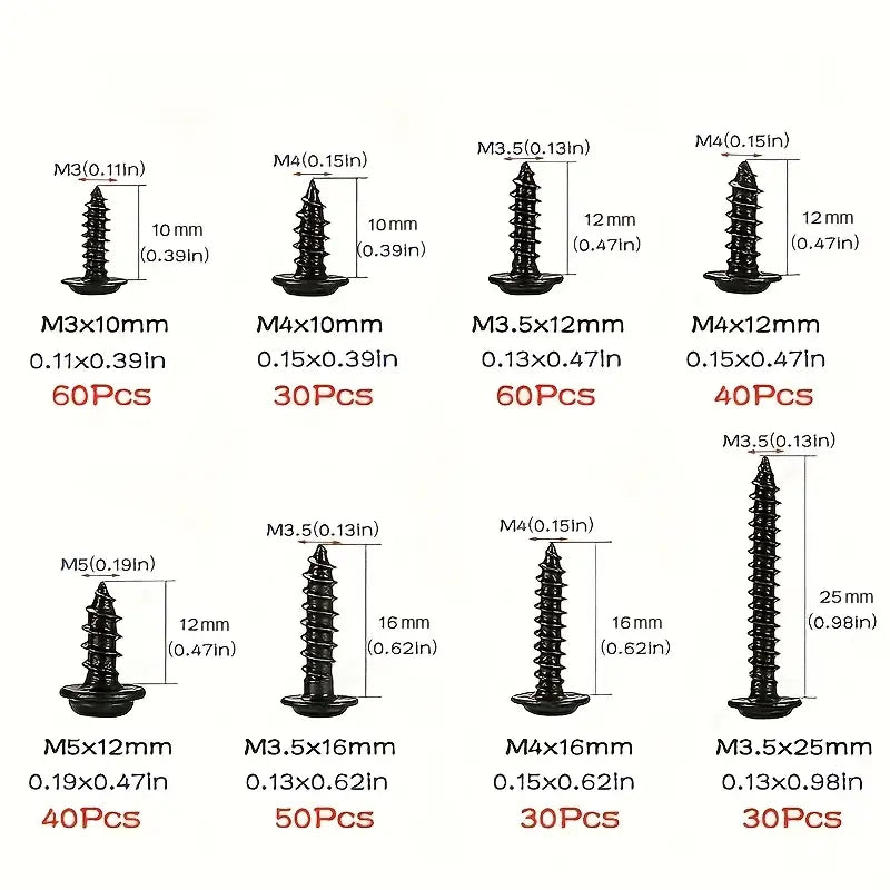 Lot de Vis Noires Auto-Perceuses avec Rondelle – Assortiment Multi-Tailles pour Bois, Métal et Bricolage