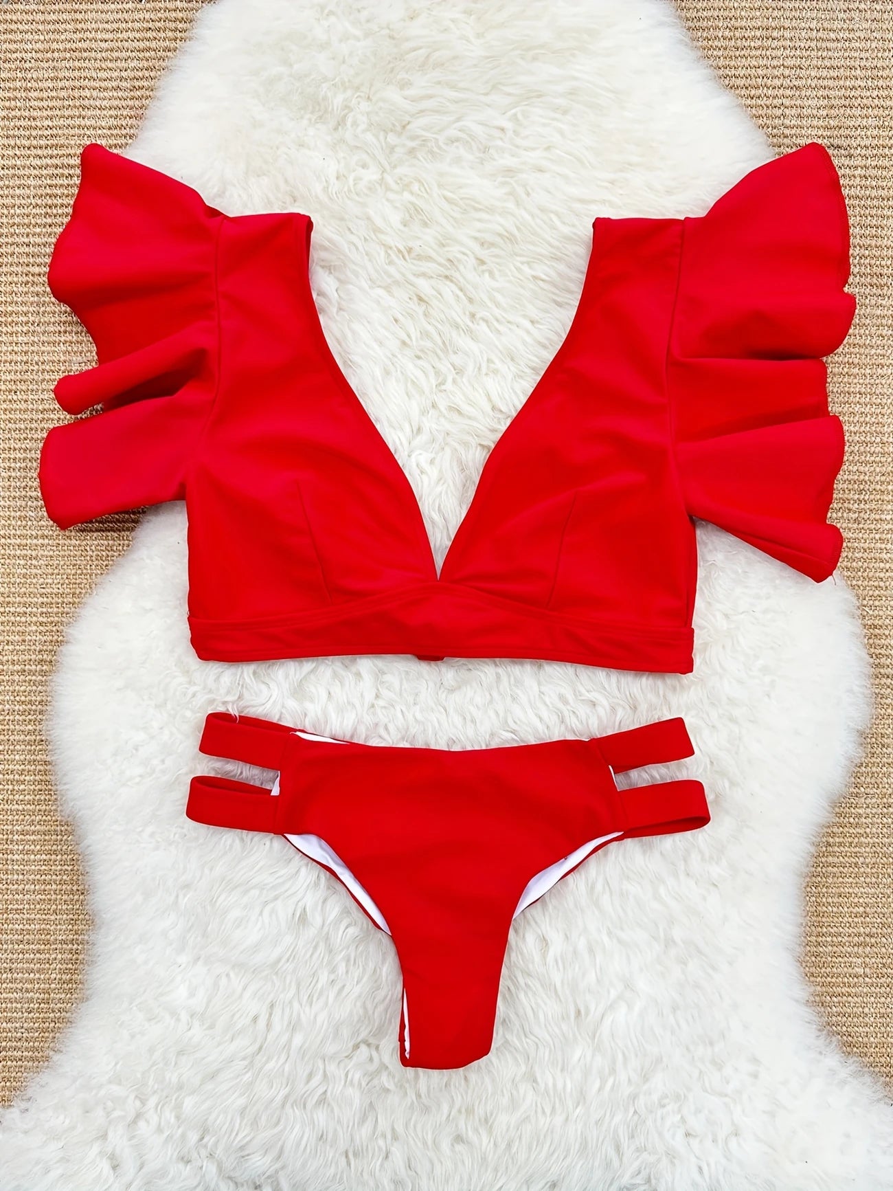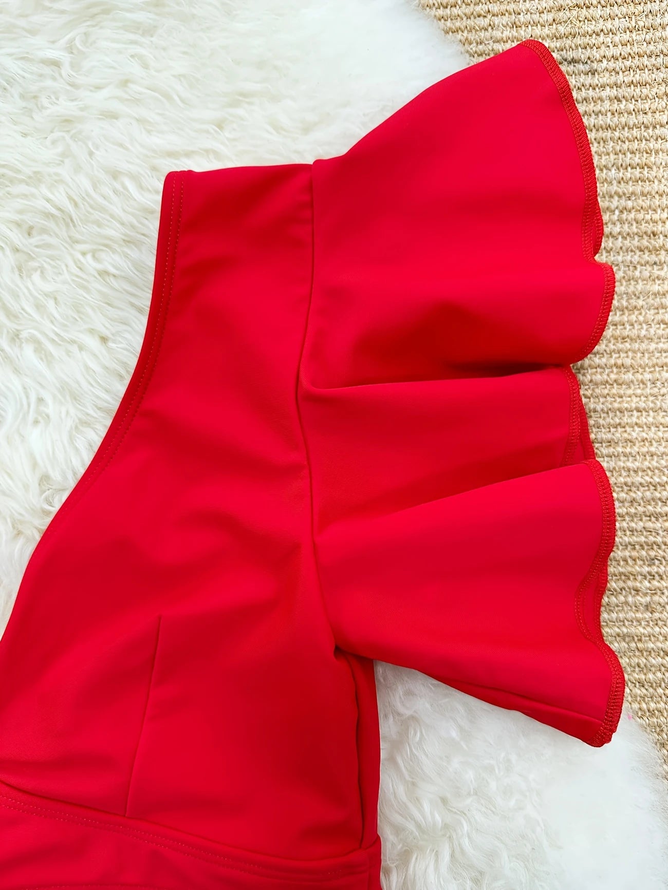 Maillot de Bain Rouge Femme Deux Pièces – Haut Volants & Culotte Découpée Sexy