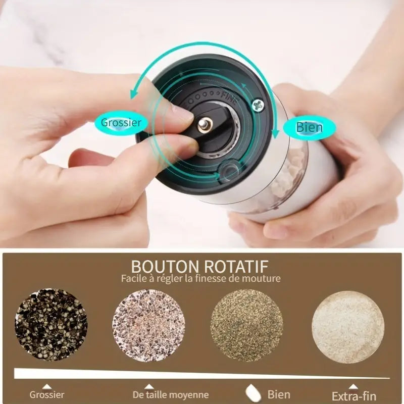 Moulin à Poivre Électrique Rechargeable – Broyeur Inox avec Réservoir Transparent