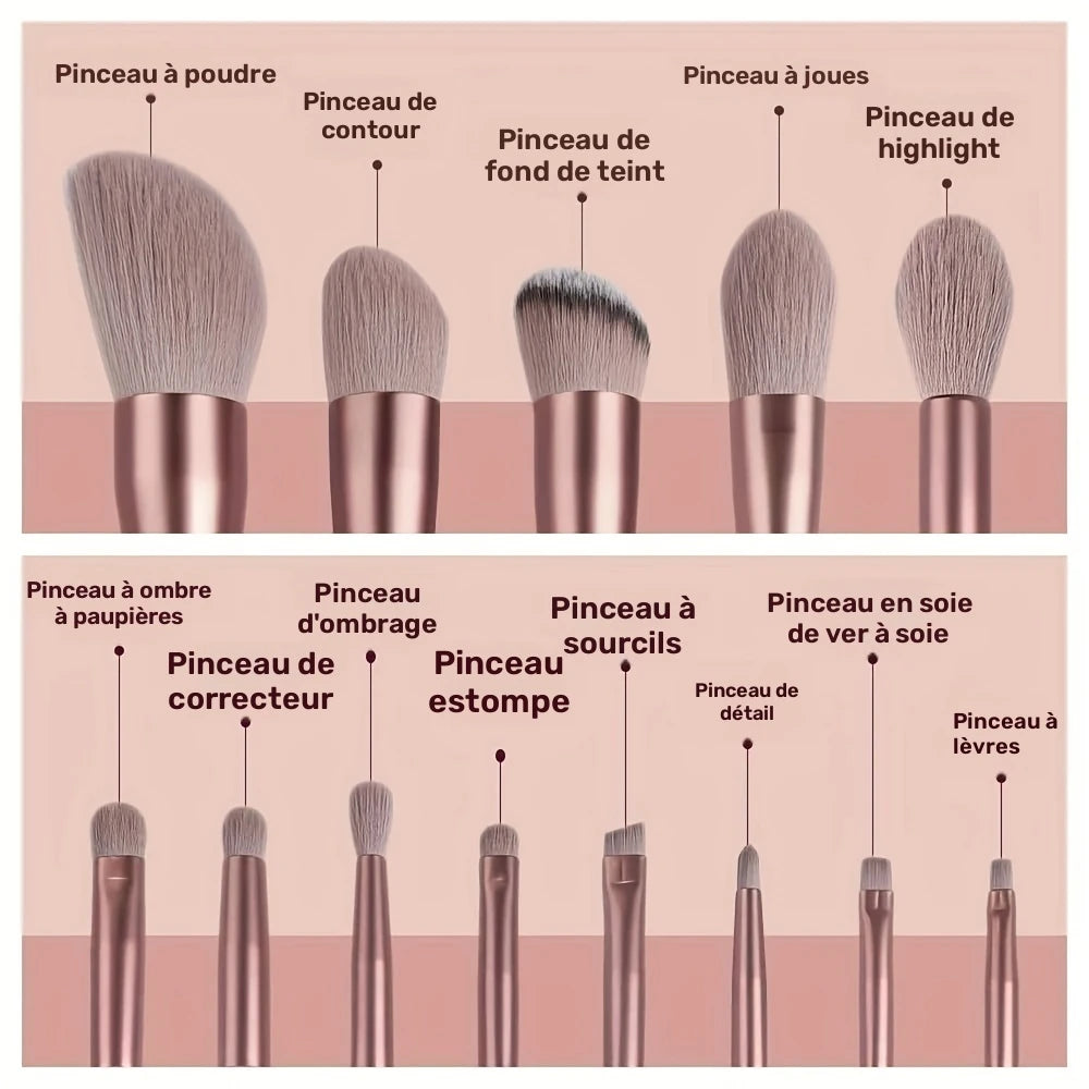 - Visage: brosse teint poudre, fond de teint, blush, bronzer/contour, highlighter, estompeur large.