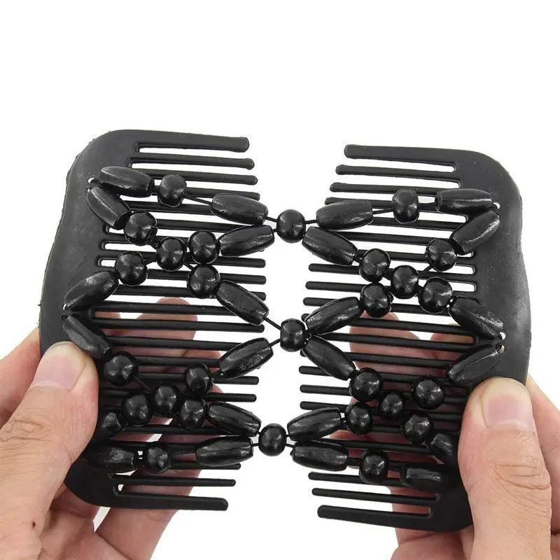Domptez vos mèches en un instant avec ce peigne magique. Ce double peigne élastique réunit deux peignes légers reliés par des élastiques résistants, ornés de perles et de strass au motif géométrique. Léger mais robuste, il s’adapte à l’épaisseur de vos cheveux pour un maintien fiable sans tirer ni casser.