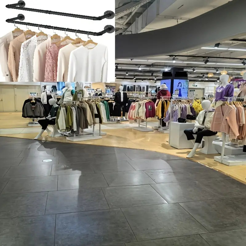 Portant Mural Industriel en Métal Noir – Barre de Suspension pour Vêtements et Présentoir Boutique
