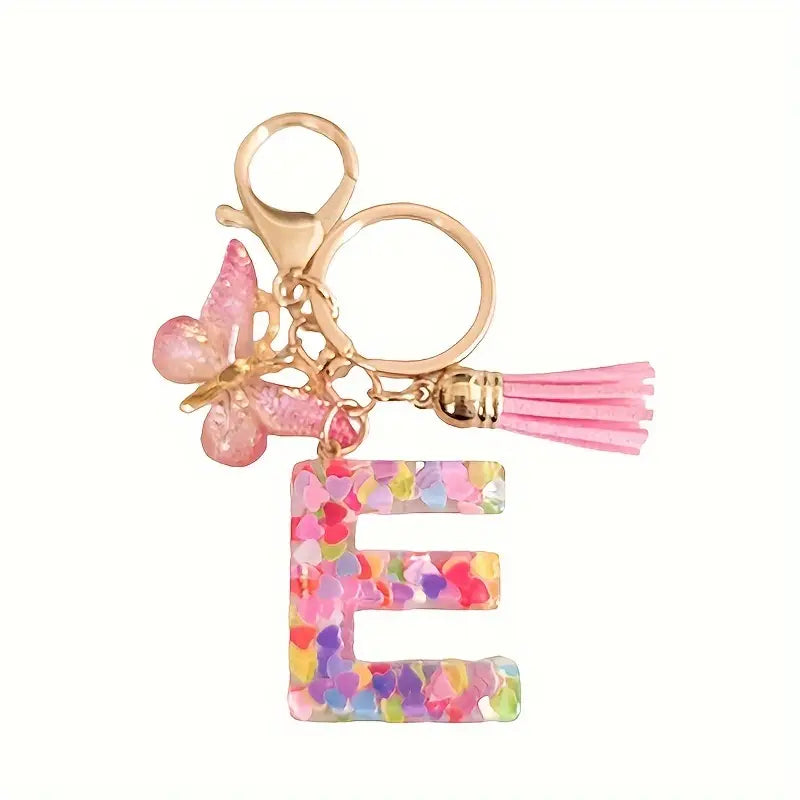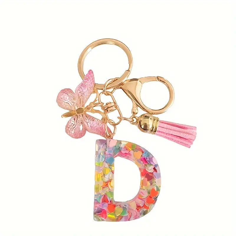 Porte-clés femme lettre initiale colorée – Breloque papillon et pompon rose tendance