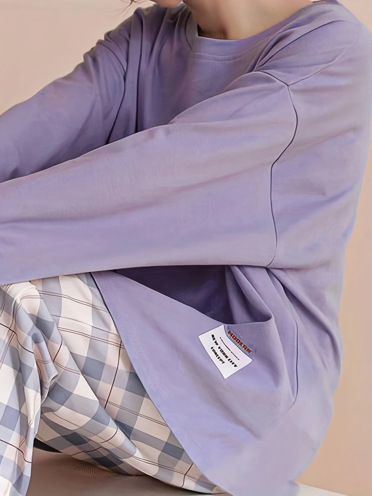Pyjama Femme Long Confort Oversize – Haut Manches Longues & Pantalon à Carreaux, Ensemble Doux et Décontracté