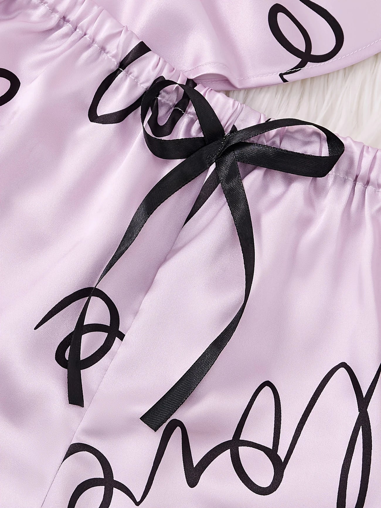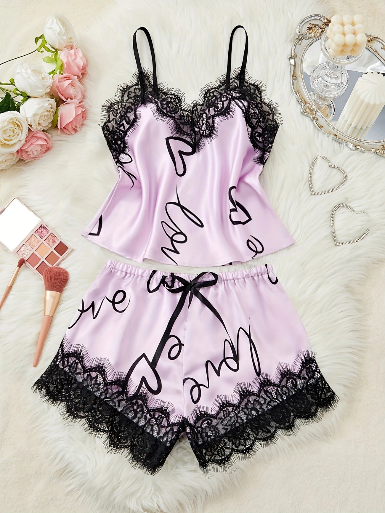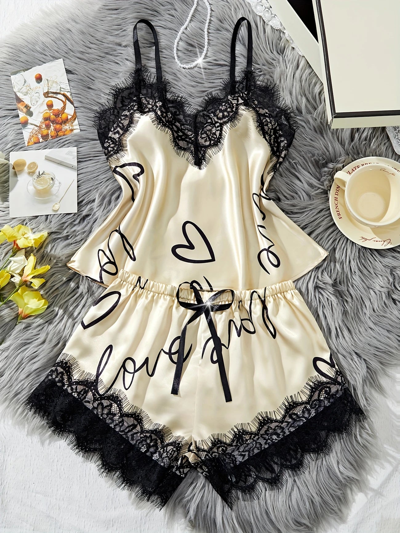 Pyjama Femme Satin Sexy Imprimé Love – Ensemble 2 Pièces avec Dentelle Noire