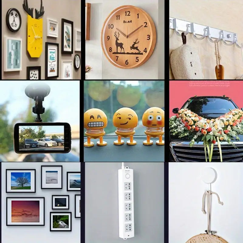- Polyvalent : cadres légers, affiches, LED, multiprises, télécommandes, coins de tapis, crochets.