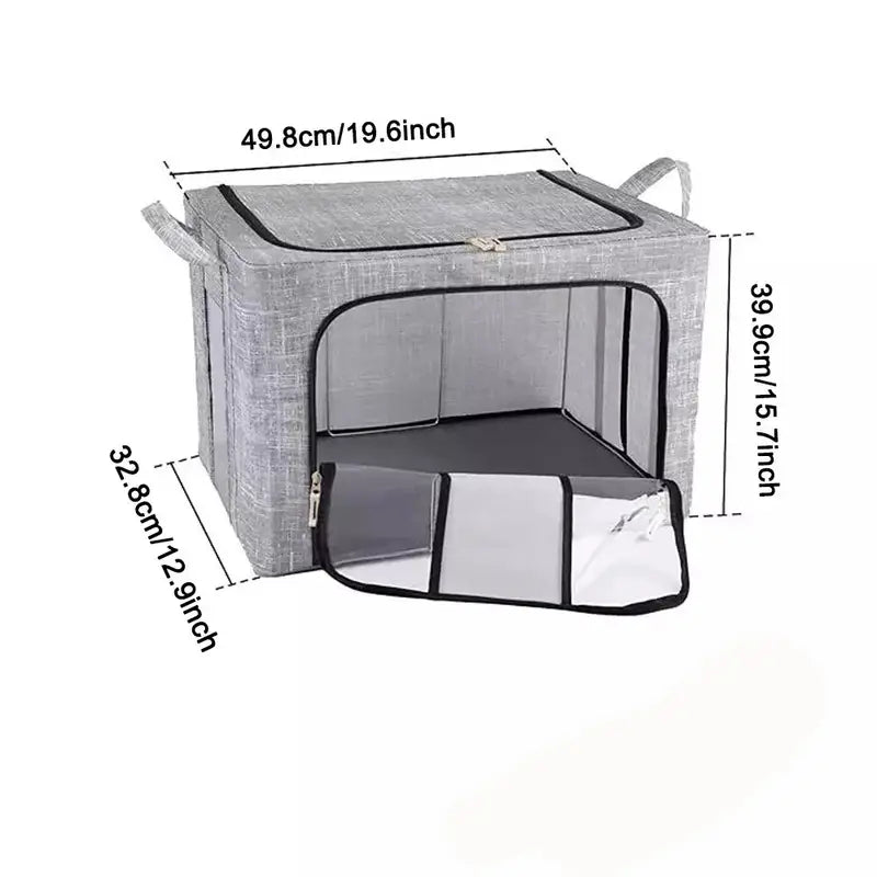La double ouverture zippée (dessus et façade) permet d’attraper une pièce sans tout déplacer. Les poignées latérales robustes facilitent la manipulation sur les étagères et dans les placards.