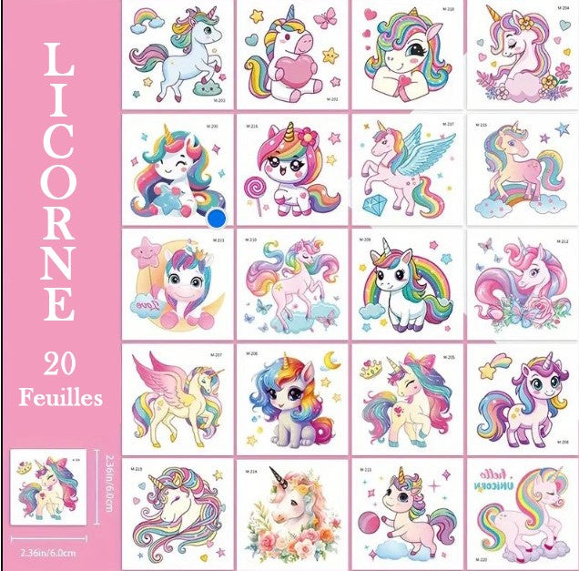 Tatouages Éphémères Licorne pour Enfants – Lot de 20 Feuilles Colorées et Mignonnes, Faciles à Appliquer