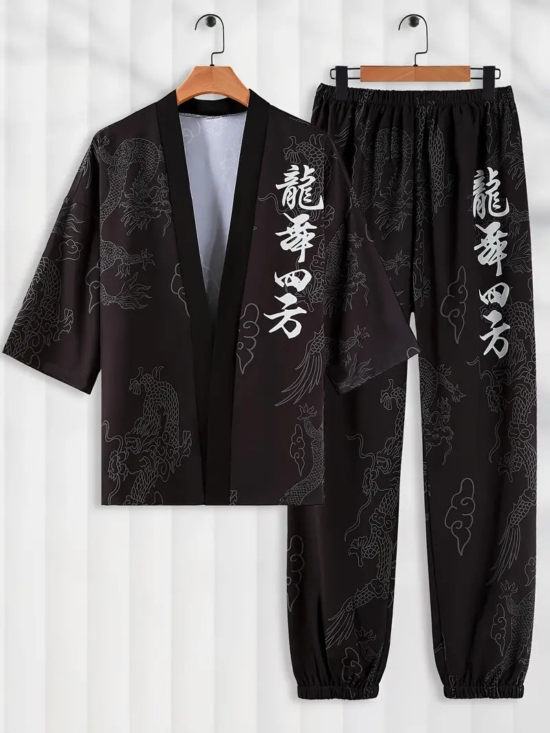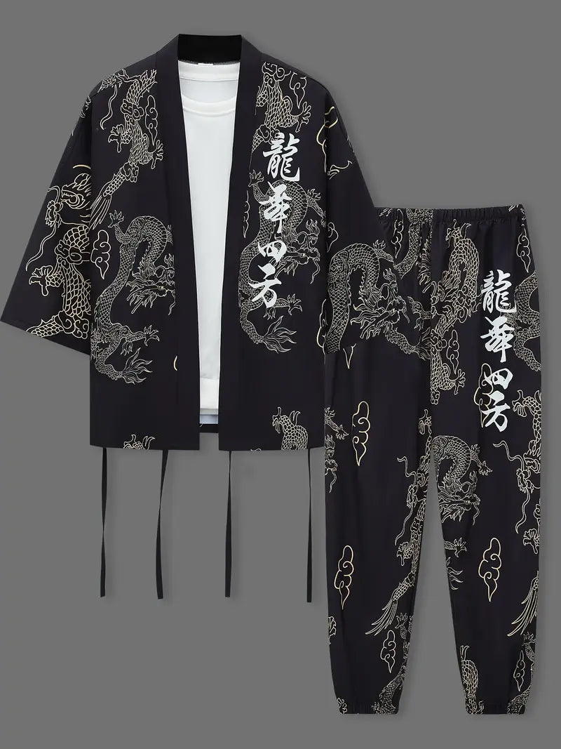 Affirmez votre style avec un ensemble kimono homme qui marie héritage et design contemporain. Veste kimono légère à manches 3/4 et pantalon coordonné: une base versatile pensée pour la rue et les moments off. Grâce à ses graphismes dragon et sa calligraphie maîtrisée, cette veste kimono moderne signe une allure assurée. Le pantalon type jogger dragon complète l’ensemble pour une tenue streetwear calligraphie au rendu premium.