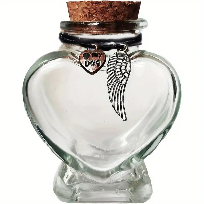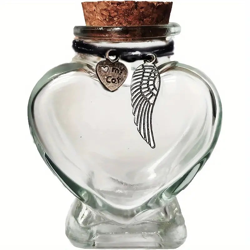 Urne Cœur en Verre pour Cendres de Chat – Souvenir Funéraire avec Charms Ailes d’Ange et 'I ♥ my Cat
