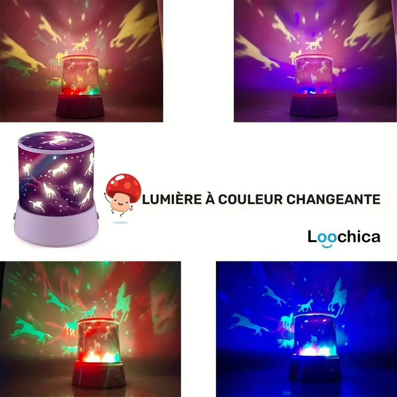 Créez une atmosphère magique en un clic. Cette lampe-projecteur transforme murs et plafond en un univers peuplé de licornes et d’étoiles, idéal pour rassurer et émerveiller. Parfaite pour le rituel du coucher, un coin lecture ou une fête à thème, elle diffuse une lumière douce qui guide l’enfant vers le calme. Compacte et simple à installer, elle se pose sur une table de nuit ou une étagère et invite instantanément au rêve.